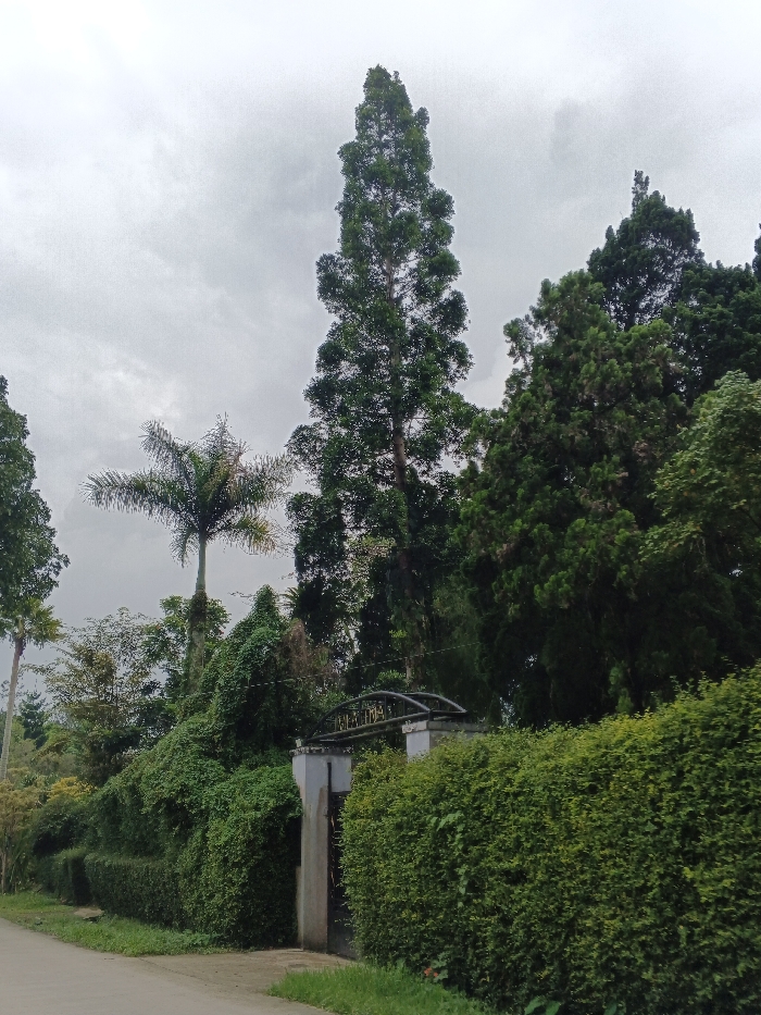 The image presents an exterior scene of a property entrance in Vang Vieng, Laos, under a uniformly overcast, light gray sky. A paved road runs diagonally across the lower-left foreground, adjacent to a narrow strip of grass and dirt. To the right, a well-maintained, dense green hedge forms a boundary, leading to a concrete or stone gate pillar on the left side of an entrance. Dark-colored gate panels are partially visible, suggesting a slightly ajar entry. Above the gate, a dark, arched ornamental structure with decorative elements displays indistinct text, likely a name or designation for the property. Behind the gate and hedge, a variety of lush, dense greenery dominates the background. Prominent features include a very tall, slender conifer-like tree rising centrally into the sky, and a large palm tree with radiating fronds positioned to the left of the conifer. Further dense evergreen trees and thick, possibly overgrown, climbing vegetation complete the verdant backdrop. No individuals or active elements are depicted within the scene.