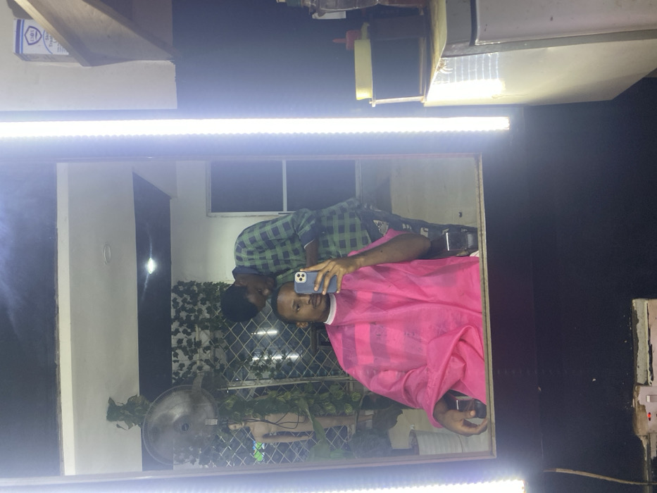Two men are reflected in a mirror. One, in a green and blue plaid shirt, stands behind the other, who is wearing a pink barber cape. The man in the cape holds a phone, seemingly taking a selfie. Behind them, through a window, is a view of greenery and a security gate. A fan and other foliage are visible in the background. Overhead are two fluorescent lights, and various items sit on a ledge above the mirror. A dark wall and electrical outlet are to the right of the mirror.