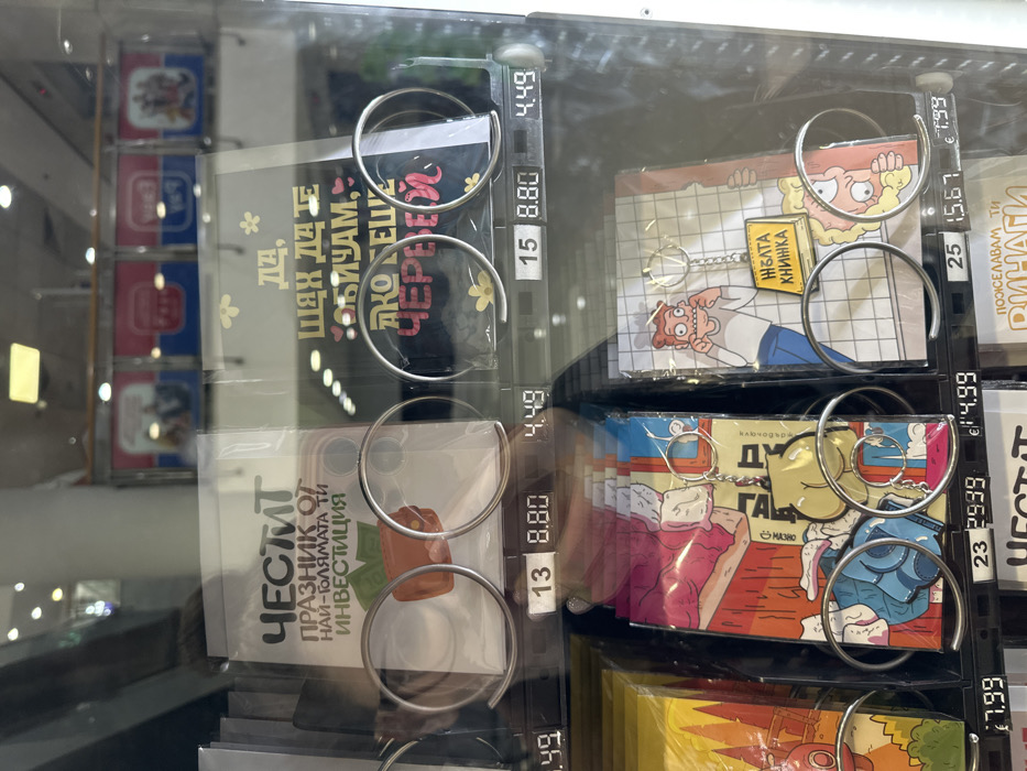 The image depicts the clear glass front of a vertical vending machine located within a commercial establishment, likely a shopping mall, in Sofia, Bulgaria. The machine showcases various humorous greeting cards and keychains. In the upper tier, two distinct items are visible, secured by spiral metal rods. The left item is a white card featuring Bulgarian text "ЧЕСТИТ ПРАЗНИК ОТ НАЙ-ГОЛЯМАТА ТИ ИНВЕСТИЦИЯ" (Happy holiday from your biggest investment) alongside an illustration of a brown wallet and green banknotes. This item is priced at 8.80. The right item is a dark card displaying the Bulgarian text "ДА, ЩЯХ ДА ТЕ ОБИЧАМ, АКО БЕШЕ ЧЕРВЕЙ" (Yes, I would love you if you were a worm) with scattered white floral designs, also priced at 8.80. The lower tier presents two sections of keychains or small souvenir items. The left section contains multiple colorful items, one prominently displaying a cartoon drawing of a person's buttocks. Text partially visible on these items includes "КАЛОВАРА СП." This item is priced at 29.99. The right section features a keychain depicting a wide-eyed, cartoon character with a shocked expression, holding a sign that reads "ЖАБА КНИЖКА" (Frog Booklet/Notebook). This item is priced at 15.67. All prices are displayed on digital screens below their respective slots. Reflections on the glass front show parts of the interior environment, including overhead lighting, a white column, and the silhouette of the individual taking the photograph, visible through the product displays. In the distant background, through the vending machine, red and blue paneled structures are faintly visible, suggesting further commercial displays or architecture.