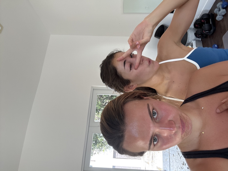 Two young adult females are depicted in an indoor setting, likely a private residence or home gym located in Palmetto Bay, United States
