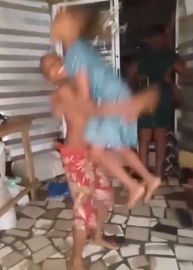 Here is a brief description of the video: A woman holding a young girl, spins around in a room. The woman is wearing a sleeveless top and red and white floral print pants. The girl is wearing a blue dress. Another woman stands in the background, wearing a green dress. The room has patterned tile floors and corrugated metal walls. A sliding glass door is behind the woman in the green dress.