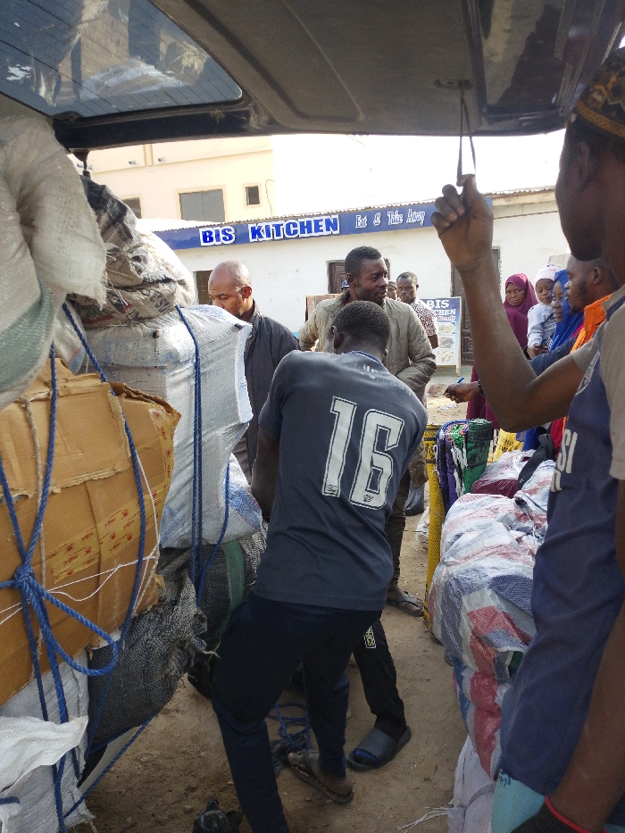 The scene depicts an outdoor commercial area in Unguwa Uku Kauyen Alu, Nigeria. In the foreground, the rear hatch of a dark-colored vehicle, likely a van or SUV, is open, revealing a tightly packed cargo area. The cargo consists of multiple large sacks (some white woven, others patterned), cardboard boxes, and bundles secured with blue ropes. A man wearing a dark grey t-shirt with the number "16" printed in white on the back, and dark trousers, is positioned centrally, bending over towards the cargo within the vehicle. He wears light-colored slide sandals. To his left, a bald man in a dark jacket looks downwards. To his right, a man in a light-colored long-sleeved shirt smiles towards the right. Partially visible in the extreme foreground right, a man in a blue sleeveless top and a patterned cap holds onto a strap from the vehicle's interior. On the ground to the right of the vehicle, additional bundled items are stacked. In the background, a light-colored building with a blue sign reading "BIS KITCHEN Eat & Take Away" is visible. Several people are gathered in the background, including two women wearing hijabs, one holding an infant, and other men. The ground surface is unpaved and appears dusty. The overall lighting suggests clear daylight.