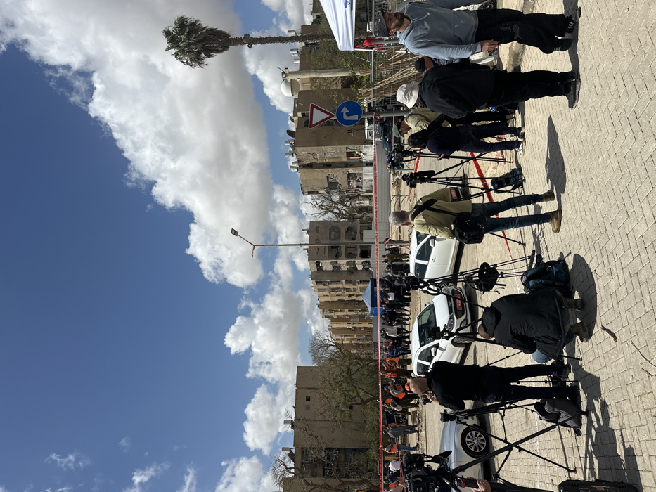 The image depicts an outdoor scene in the city of Arad, Israel, under a bright blue sky with scattered white cumulus clouds. In the foreground, a paved area with light-colored pavers is occupied by approximately ten media personnel. They are primarily men, equipped with professional video and still cameras mounted on multiple black tripods, facing towards the midground and background. One individual is crouching while operating a camera. Separating the media from the main incident area is a horizontal line of red and white barrier tape. Beyond this tape, a crowd of approximately 20-30 individuals is gathered. This group includes emergency responders wearing orange vests, security personnel in military-style uniforms, and other civilians. Two white passenger vehicles, resembling Chevrolet Spark models, are parked on a paved surface behind the media but in front of the larger crowd. A dark blue canopy tent is visible within the cordoned-off area further back. In the background, multiple multi-story residential buildings, constructed of light brown or beige concrete, display significant structural damage. Numerous windows are missing, and large sections of the outer walls, balconies, and internal structures are exposed or collapsed, indicating extensive impact. Sparse, leafless trees are visible between the buildings, and one tall palm tree stands on the far right. A street light pole and two traffic signs – a red inverted triangle "yield" sign and a blue circular "turn right" sign – are also present. On the far right, a white canopy tent is partially visible. The scene suggests a post-incident environment, likely a damage assessment or investigation following an event.