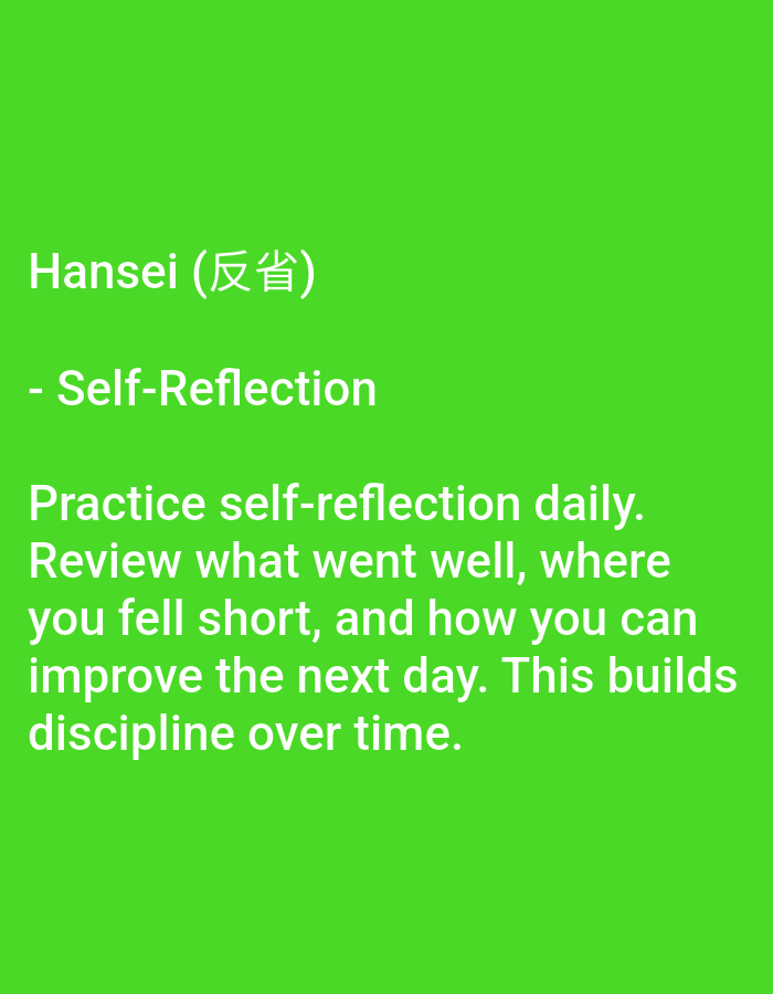 The image displays a digital graphic with a solid vibrant green background. White text is left-aligned and positioned in the central vertical area of the graphic. The first line of text reads "Hansei (反省)", followed by "- Self-Reflection" on the next line. Below this, a paragraph of text reads: "Practice self-reflection daily. Review what went well, where you fell short, and how you can improve the next day. This builds discipline over time." No individuals, physical subjects, objects, actions, or interactions are present. The environment is a static digital display; no physical location in the city of Unknown, Unknown, is depicted.