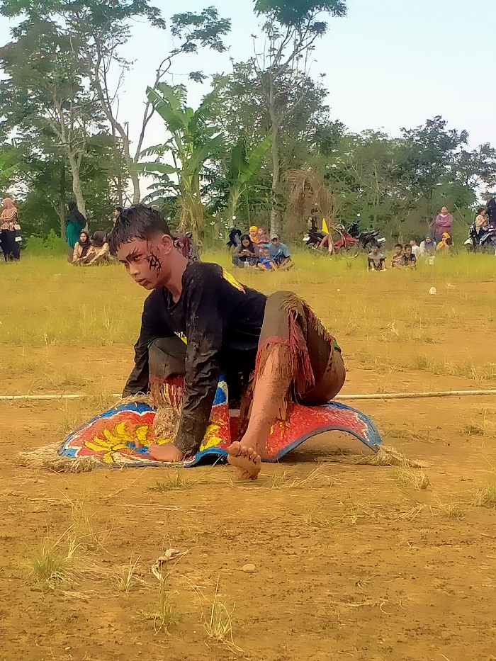 In an open, dry field with sparse yellowish-green grass, located in Sidomukti, Indonesia, a young male performer is positioned centrally. He has short dark hair and his face is marked with red and black paint, particularly on his left cheek and around his left eye, suggesting stylized wounds. He wears a dark, long-sleeved shirt and dark pants, both visibly soiled with mud or dirt. His right pant leg features reddish fringed fabric and is heavily caked with mud. His bare feet are also soiled. The performer is partially kneeling or crouching, with his left hand on the ground or a prop, and his right leg bent, resting on a colorful, stylized flat prop. This prop is decorated with bright blue, yellow, and red patterns, resembling a traditional hobby horse, and features a textured, possibly fringed, edge. The performer's gaze is directed towards the viewer with a serious expression. In the mid-ground and background, a diverse group of spectators, including adults and children, are seated or standing on the grass, observing the performance. Some individuals are wearing headscarves. Several motorcycles are parked among the spectators and trees. The background consists of green trees and foliage under a pale sky.