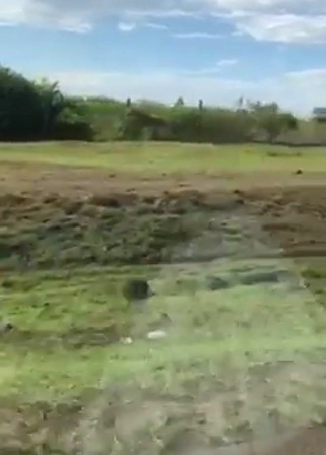 landscape view from a moving vehicle. The scenery consists of a flat, open field with patches of green grass and bare dirt. A fence runs along the edge of the field, separating it from a line of trees and bushes. The sky is visible, featuring scattered clouds. The camera's movement is evident, and there's a noticeable glare on the window. The overall impression is one of a rural or agricultural setting.