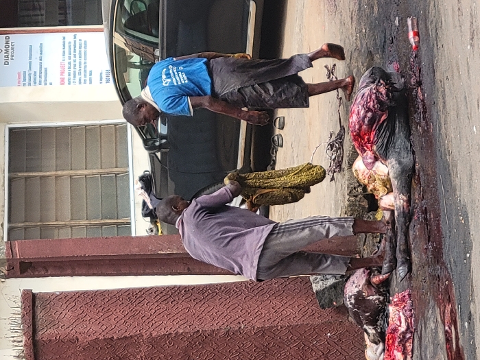 - "The scene depicts an outdoor butchering operation in Onitsha, Nigeria, occurring on a paved surface adjacent to a building" by FM-hljAh2, licensed under CC BY 4.0