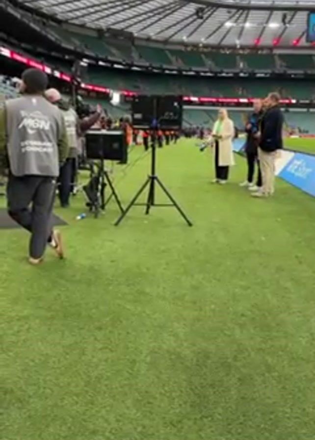 The scene is set at a large sports stadium, likely a rugby ground, with a green field and covered stands visible in the background. The lighting is overcast, suggesting a cloudy day. Several people are visible on the field, a woman in a cream-colored coat and headscarf stands speaking to two men in casual attire, one wearing a blue blazer. They appear to be engaged in a conversation, possibly an interview or pre-game discussion. Professional camera and sound equipment are set up nearby, including a large speaker on a tripod. The presence of crew members with "MSN" emblazoned on their jackets suggests a media or broadcast team at work. A branded banner with the words "RTE Score" can be seen along the sideline.