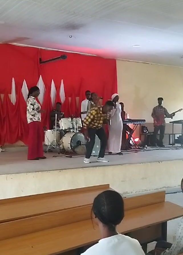 live band performing on a stage in what appears to be a church or auditorium. There are six people on the stage: two female vocalists, one male vocalist, a drummer, a keyboardist, and a guitarist. The stage is decorated with a red backdrop with white fabric accents. The band members are dressed casually. In the foreground, a woman sits on a wooden bench facing the stage. The room has a simple, functional design with wooden benches for seating. The lighting is bright. The camera is stationary. The overall atmosphere is one of a religious service or event.