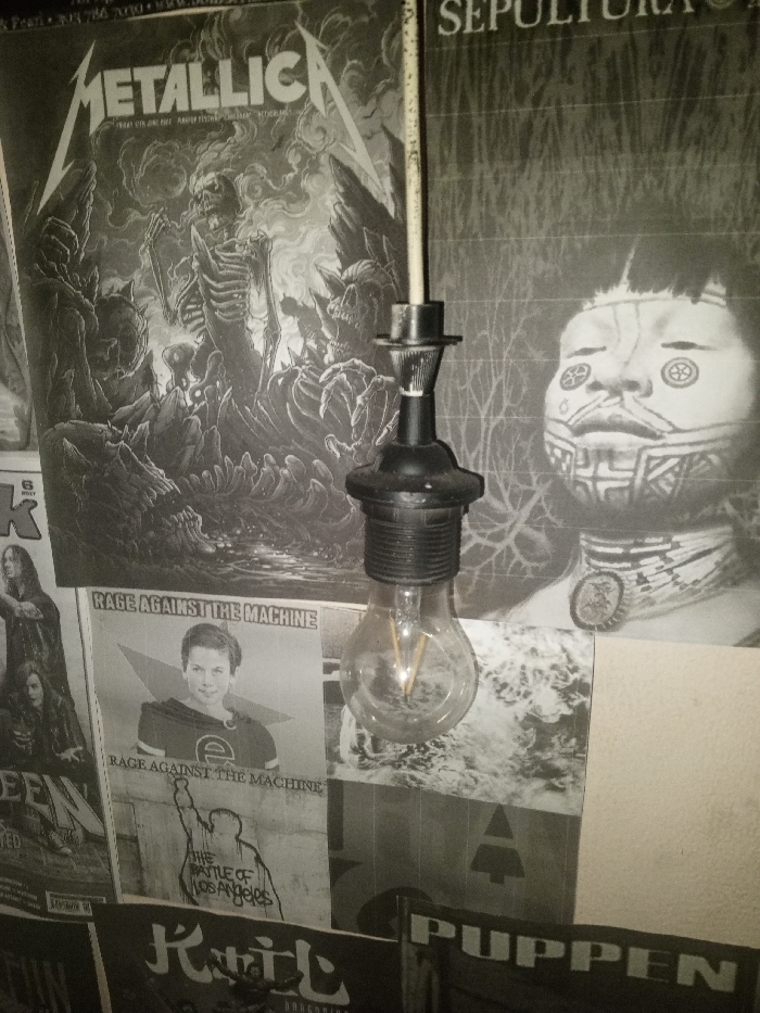 The image showcases a collage of black and white band posters, predominantly featuring metal and rock groups. "Metallica" is prominently displayed at the top left. Other recognizable bands include "Rage Against the Machine," "Sepultura," and "Kult." A bare lightbulb fixture hangs in the foreground, obscuring parts of the posters. The overall aesthetic suggests a music enthusiast's room or a wall dedicated to their favorite bands.