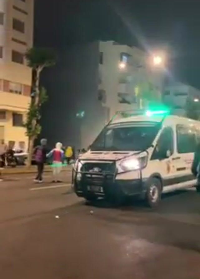 At night, a white Ford Transit van with green flashing lights approaches a crowd of people