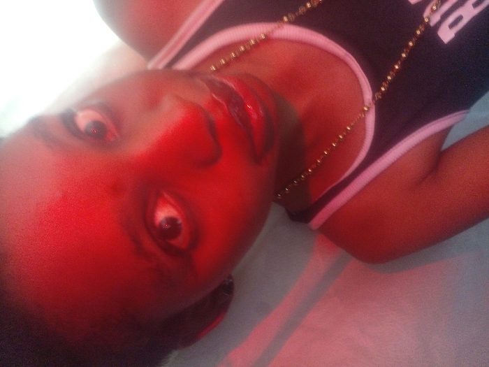 This image captures a close-up, high-angle portrait of an individual, likely female, with dark skin, located in Badore, Nigeria. The subject is positioned with her head tilted, looking directly into the camera. She wears a dark-colored tank top with light-colored trim around the neckline and shoulder straps. A thin, gold-colored beaded necklace is visible around her neck. Her lips are slightly parted, appearing glossy, and her eyes are wide open. The entire scene, particularly the subject's face and upper body, is heavily illuminated by a strong red light source, casting a pronounced reddish hue over the skin and clothing. The background is indistinct, showing a lighter surface on the left and a very bright white light source on the right.