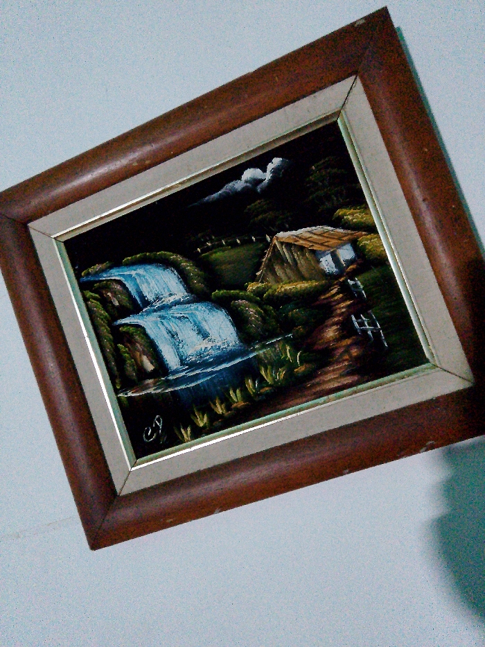 A framed painting shows a nighttime landscape with a two-tiered waterfall cascading into a dark pool
