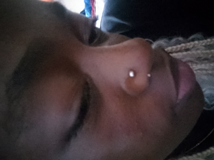 The scene, set in Ado, Nigeria, is a close-up, darkly lit vertical portrait focusing on the left side of an individual's face. The person has a dark skin tone, with their eyes appearing closed or cast downwards. Dark eyebrows are visible above the eye. The nose features two small, spherical, light-colored metallic studs: one positioned on the bridge of the nose, and another on the philtrum above the upper lip. The mouth is partially visible, with lips appearing slightly parted. Light-colored, possibly blonde or grey, braided hair hangs down on the right side of the frame. A thin metallic chain, likely a necklace, is visible against dark fabric on the person's upper body. The background is indistinct, blurry, and dark, with faint suggestions of muted colors (possibly blue and red fabric) in the upper right. No discernible actions or interactions are depicted.