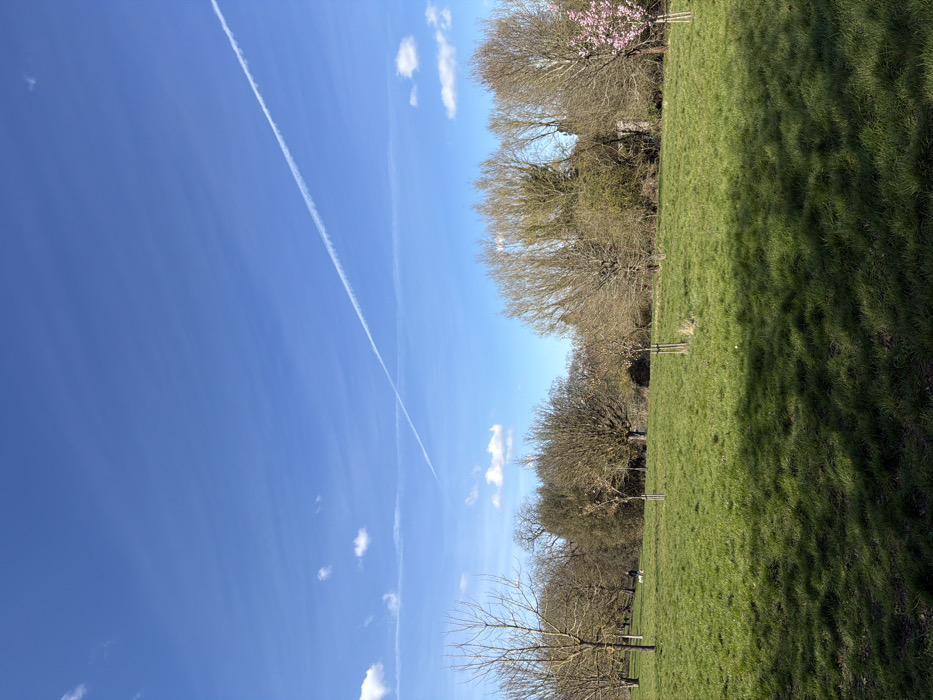 The image depicts an open parkland environment under a clear blue sky, located in Maidstone, United Kingdom, consistent with a large municipal park such as Mote Park. The sky, occupying the upper third of the frame, is predominantly clear blue with scattered small white clouds. A distinct white contrail diagonally traverses the sky from the lower-left to the upper-right, intersecting a fainter, horizontal contrail positioned lower in the sky. The lower two-thirds of the image display a wide expanse of bright green grass, exhibiting areas of shadow in the immediate foreground. Numerous deciduous trees with bare branches or early budding foliage form a dense line in the midground and background. Several smaller, recently planted trees, each secured with a wooden stake, are sparsely distributed across the grassy areas. A single tree on the far right side of the frame is in blossom, displaying vibrant pink flowers. In the mid-distance on the left side, a solitary individual, appearing to wear dark clothing, is observed walking a small, dark-colored dog on a leash. No other human activity or interaction is discernible. The overall illumination is consistent with natural daylight, suggesting a season of late winter or early spring due to the mix of bare and blossoming trees.