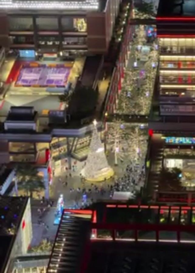 n aerial view of a city street at night. The street is decorated for Christmas, with a large Christmas tree in the center and trees lining the street covered in lights. People are walking along the street. The buildings surrounding the street are lit up with red neon lights. To the left of the Christmas tree is a purple basketball court.