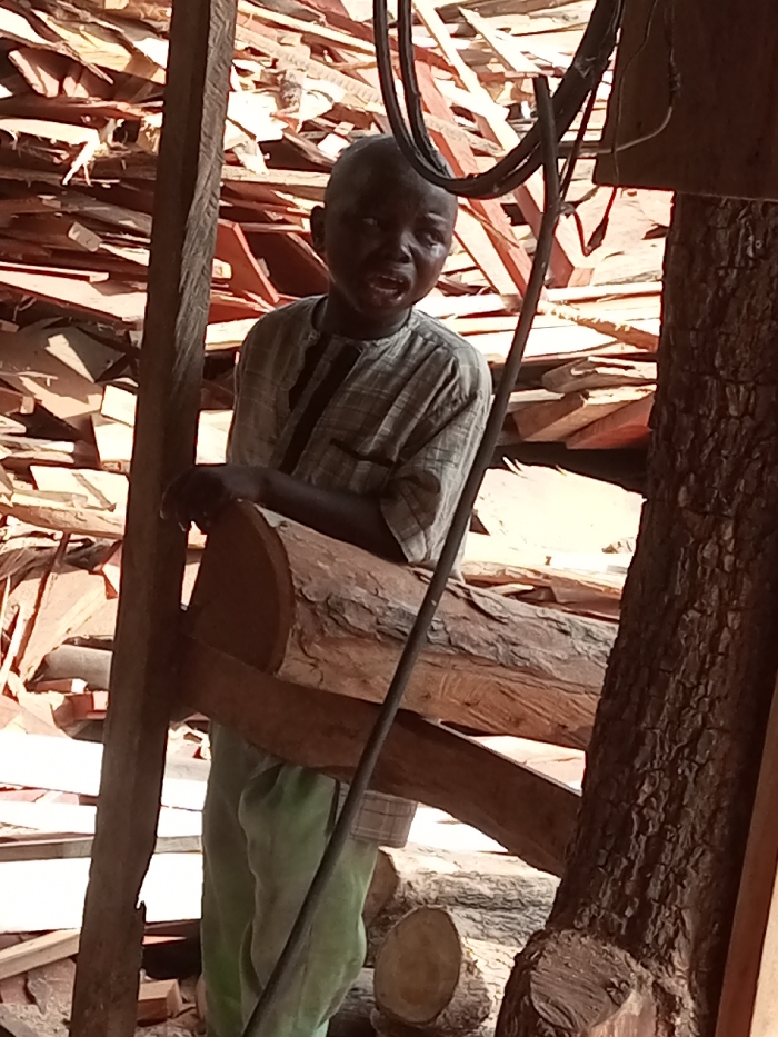 A young boy stands among logs and wooden planks. He wears a patterned shirt and light-colored pants, resting his arms on a large, roughly hewn log. His mouth is open as if speaking or calling out. Wires hang overhead and tree trunks stand nearby, giving the impression of a lumberyard or wood processing area.