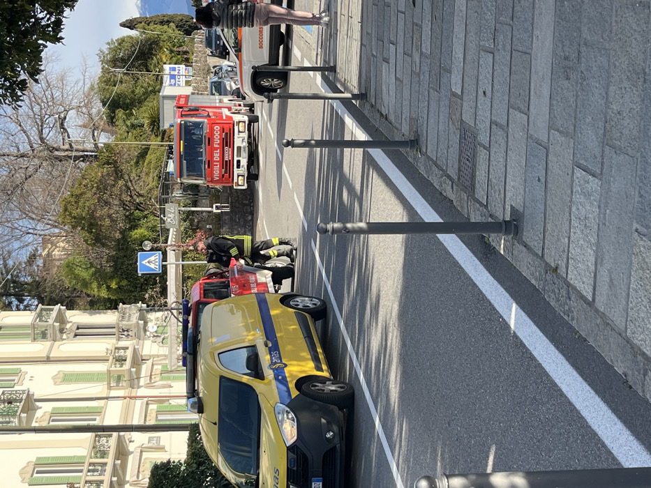 The scene depicts a roadside incident response on a sunny day in Griante, Italy
