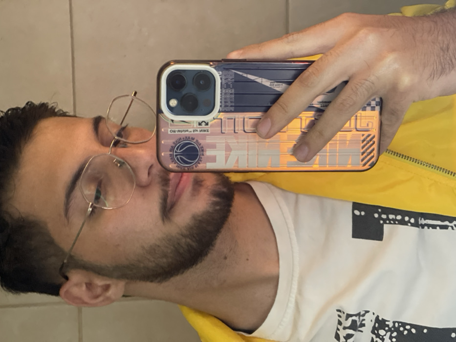 An image, reportedly taken in the city of Homs, Syria, depicts a young adult male capturing a mirror selfie. The subject, viewed from the chest up, has short, dark hair, a trimmed beard, and a mustache, and wears round, thin-rimmed glasses. He is dressed in a white t-shirt with a partial black and white graphic design, covered by an unzipped, bright yellow jacket. His right hand holds a smartphone, visible in the lower right, angled towards the mirror to capture his reflection. The smartphone is encased in a distinctive two-toned protective cover: the left side is light pink/orange with a grid pattern, a basketball logo, "OFF-WHITE™" text, and the word "NIKE" vertically displayed; the right side is dark blue/black with vertical stripes and a white Nike swoosh. The phone's multi-lens camera module is visible in the upper left corner of the case. The background consists of a plain, light-colored wall or tiled surface, indicative of an indoor environment with artificial lighting.