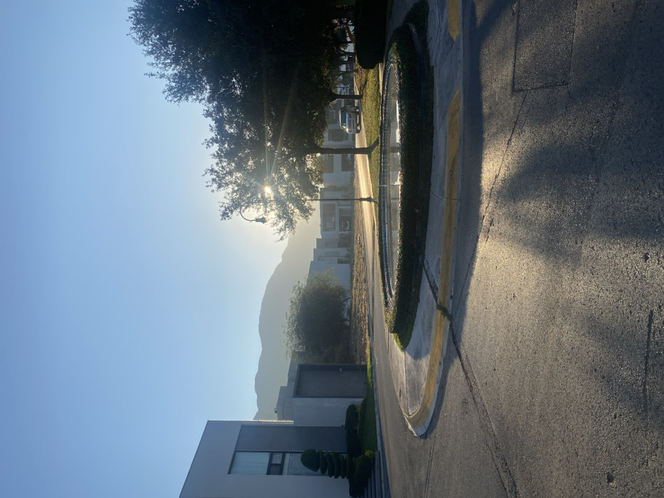 This image depicts an early morning street scene in a modern residential area within Monterrey, Mexico, characterized by a mountainous backdrop. The sky is clear and light blue, with a bright haze near the horizon where the sun is rising on the right, casting long shadows and producing a lens flare through a prominent tree. In the foreground, an asphalt road curves to the left, marked by yellow-painted curbs. Centrally positioned within the road is a circular traffic island or roundabout, featuring a low, manicured green hedge enclosing a shallow, circular water basin. A dark, traditional-style lamppost with a curved arm stands within this island. To the left, a multi-story, contemporary residential building with light-colored facades and dark-framed windows is visible, featuring a sculpted spiral-shaped topiary near its entrance. Several similar modern residential structures line the road in the midground and distance. Hazy mountains form a distinct silhouette across the background horizon. Various trees with dark foliage, some casting significant shadows, are interspersed throughout the scene, particularly on the right side. A light-colored SUV is visible driving or parked on the road in the far distance, partially obscured by trees. No people are present.
