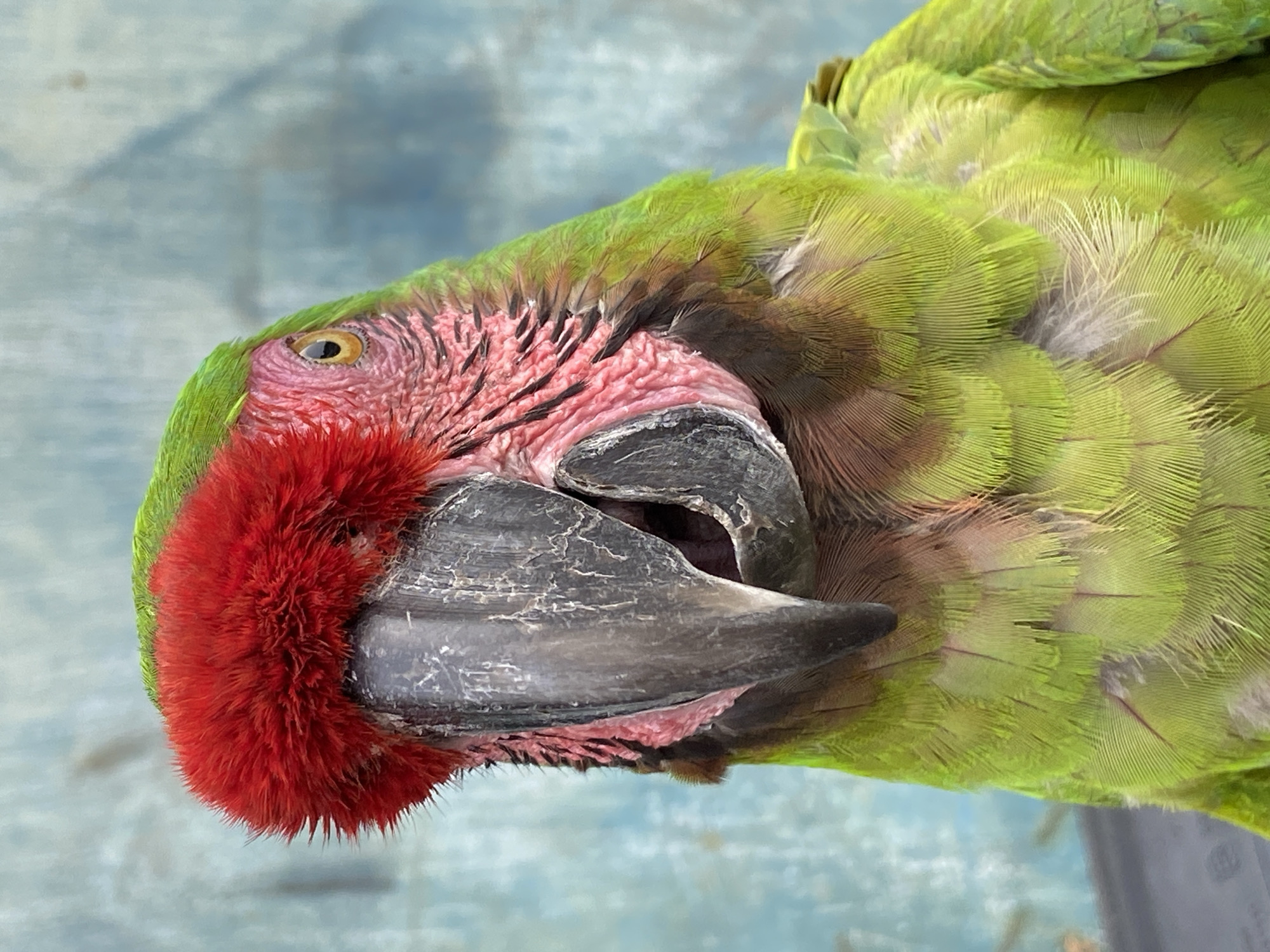 A close-up photographic portrait depicts a macaw in San José de Barlovento, Venezuela. The bird is oriented slightly to the right of the frame, its head and upper torso prominently displayed against an unfocused, light blue-grey textured background. The macaw presents a vibrant red crown and forehead, with the remaining visible plumage being predominantly iridescent green. Its bare facial skin is pink, textured, and marked with sparse lines of black feathers, surrounding a yellow eye with a dark pupil. The large, dark grey beak is partially open, revealing the internal oral cavity. The beak surface exhibits fine cracks and a textured appearance. The lower left foreground shows a dark, indistinct object. No other subjects or interactions are visible.