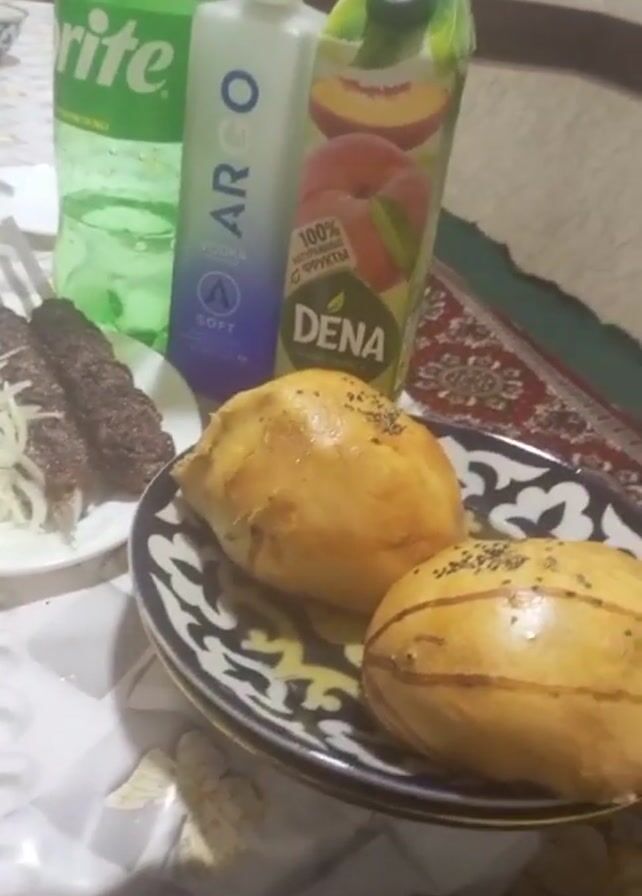 A low-angle, medium shot shows a table laden with food and drinks, plus a cell phone. A plate of grilled kebab and sliced onions sits beside a patterned dish holding two golden-brown pastries. Behind them are a bottle of Sprite, a bottle of Argo vodka, and a carton of Dena peach juice. Other small dishes with condiments are also visible. A cell phone lies in the foreground. Music plays in the background.
