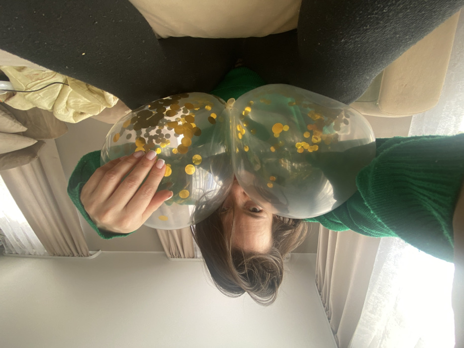 A person holds two clear balloons filled with gold confetti. The balloons obscure part of the person's face. The person wears a green sweater. Above the balloons, the person is wearing black pants and is sitting on a tan couch. Light-colored curtains hang in the background. The photograph is taken from a low angle, looking up. The floor is white.
