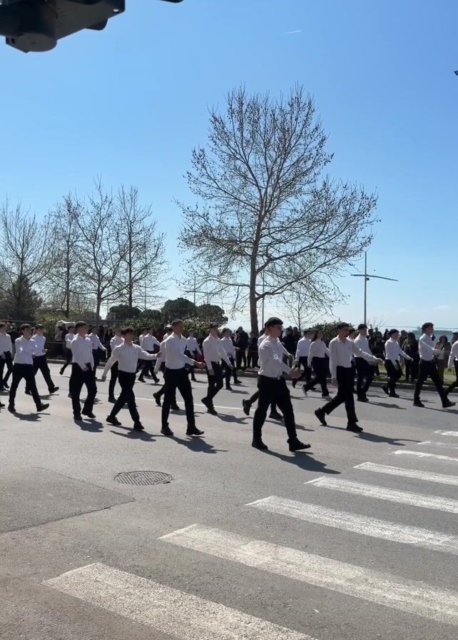 A wide shot shows a large group of uniformed young men marching in unison across a pedestrian crosswalk on a sunny day. The men wear white long-sleeved shirts and black pants. A sparse tree is behind them, with a line of bare trees further back. On the right of the frame, spectators watch the parade. A traffic light is visible in the upper left corner. The sky is a clear blue.
