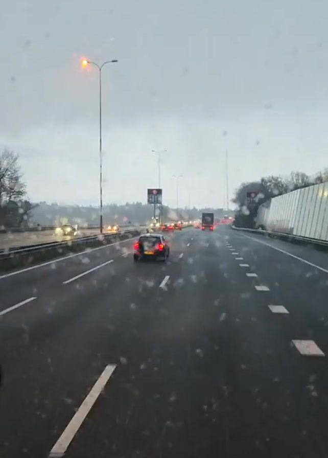 driver's perspective of a highway during a snowfall. The road is wet with slush, and snowflakes are visible on the windshield, gradually accumulating on the left side. Multiple vehicles, including cars and trucks, are visible ahead on the highway, with their brake lights illuminating the scene. Overhead highway signs with green arrows point towards routes labeled A28 and E30, indicating the directions to Amersfoort-Zuid. The environment appears overcast and gray, indicating poor weather conditions. The dashboard and steering wheel of the vehicle from which the video is recorded are partially visible. A smartphone holder is attached to the windshield.