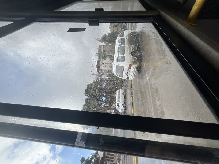 A rainy view from a bus window shows a wet street with several white vans parked along the curb