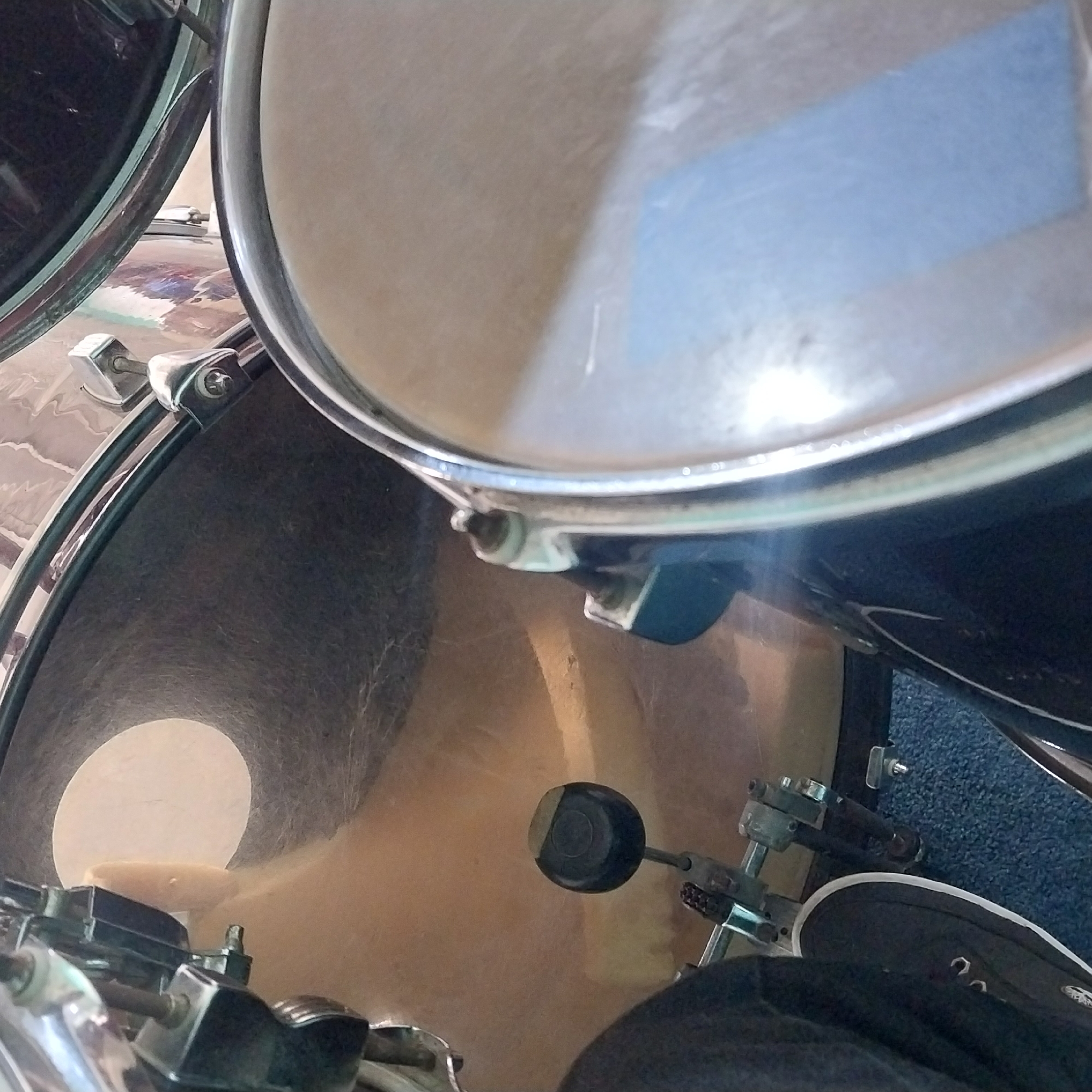 drum set, specifically focusing on the bass drum and a smaller tom drum above it
