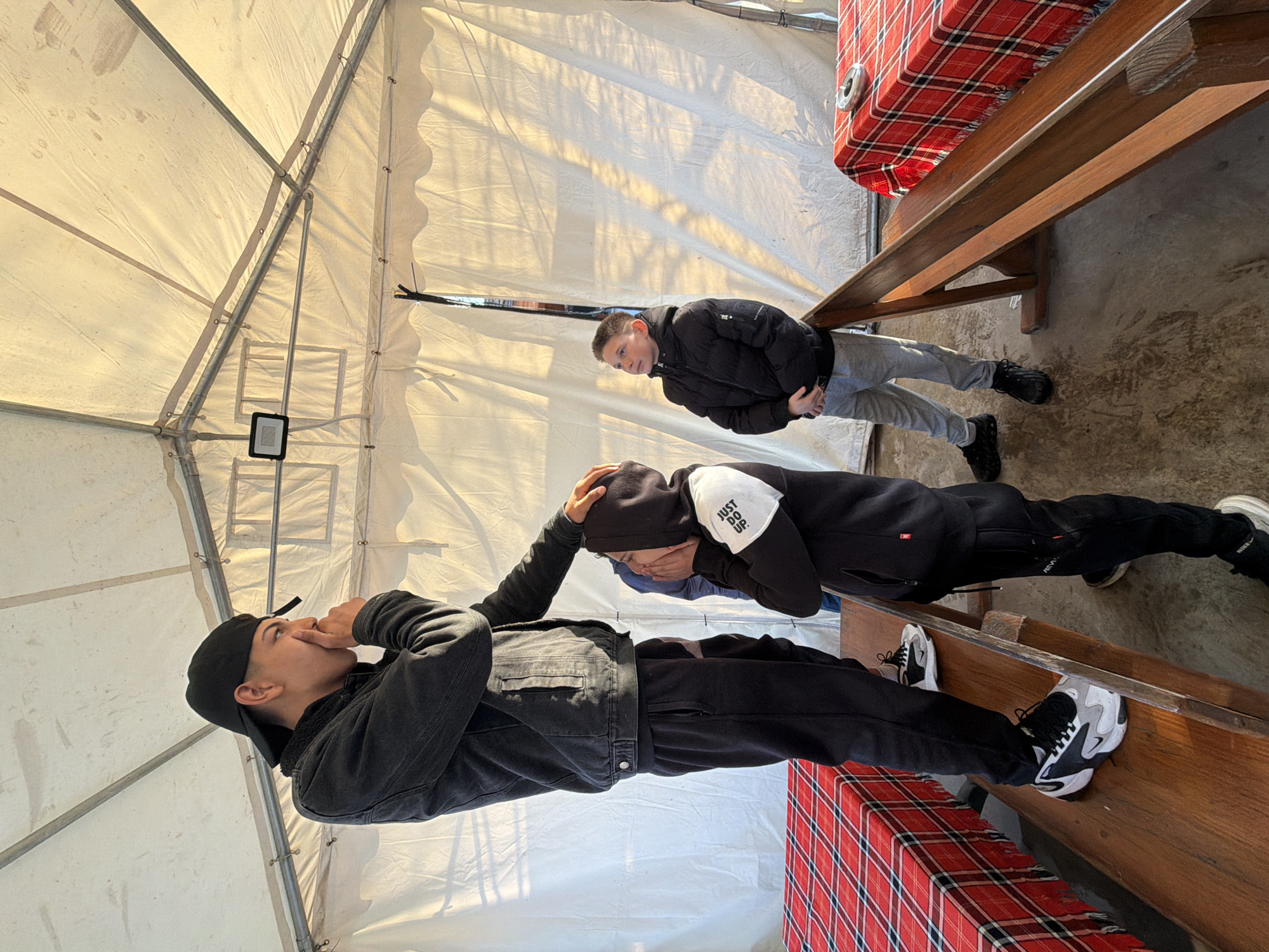 Three young males are sitting on benches inside a tent. The bench is covered with a red-and-black checkered tablecloth. The tent has a white fabric cover with a metal frame. The location is Zlatna Panega, Bulgaria. One male is wearing a black hat, a black jacket, and black pants. He is holding his hand near his mouth. Another male is wearing a black hooded sweatshirt with a white patch on the sleeve, black pants, and black and white sneakers. He has his hand on his head. The third male is wearing a black puffy jacket and grey pants.