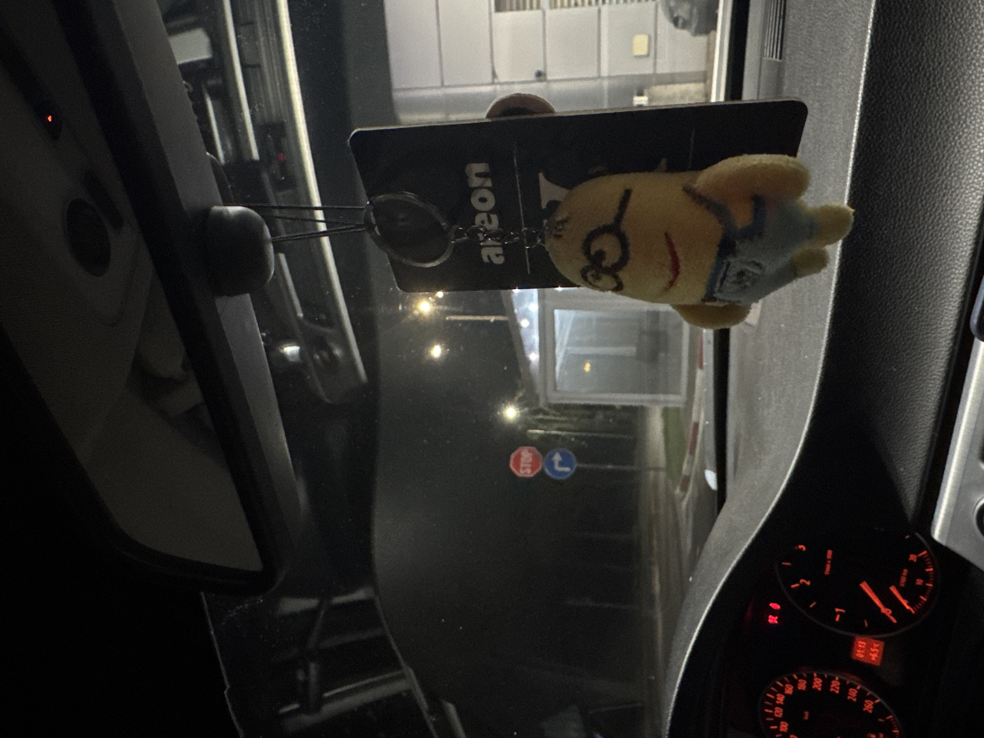 interior of a car, specifically the view through the windshield and the dashboard. A rearview mirror is visible on the left. Hanging from the rearview mirror is a black air freshener card with the word "areon" printed on it and a small yellow stuffed toy attached. Through the windshield, a street scene can be seen, including traffic signs. The dashboard features a speedometer and tachometer, with illuminated numbers and needles. The street scene outside shows an unidentified location in the city of Velingrad, Bulgaria, due to the presence of signs in Bulgarian.