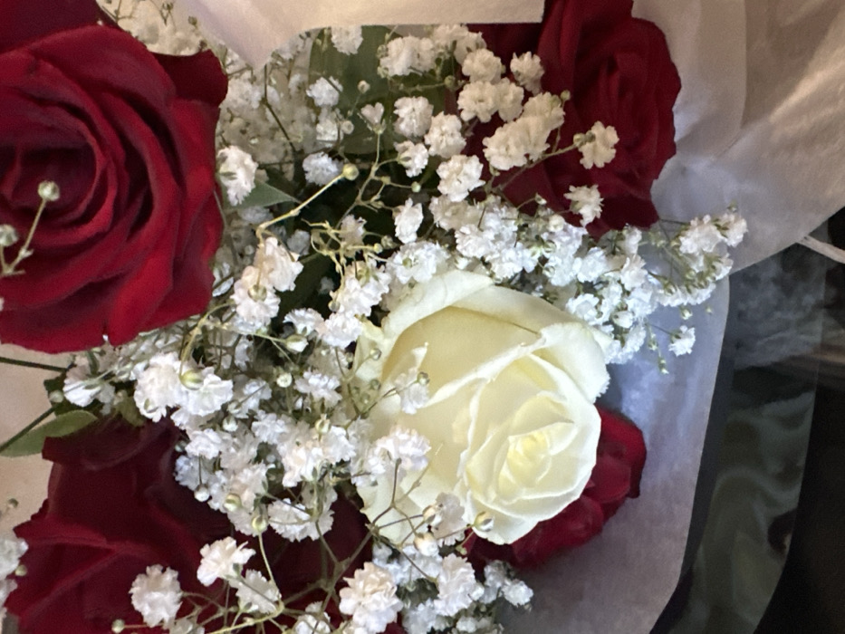 A floral bouquet is depicted in a close-up, top-down view, located in Saint-Germain-en-Laye, France. The arrangement features several deep red roses and one distinct cream-colored rose, centrally positioned in the lower portion of the image. Numerous small white Baby's Breath (Gypsophila) flowers are distributed throughout, filling the spaces between the larger roses. The flowers are clustered tightly. The base of the bouquet is encased in a light-colored, possibly translucent, wrapping material visible along the bottom and right edges of the frame. A dark, unfocused surface is observable beneath the bouquet's wrapping in the lower left quadrant.