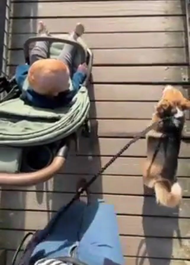 A top-down shot shows a person walking on a wooden path, pushing a stroller to their left and holding a dog leash to their right. The person is wearing jeans and a striped shirt under a dark blue cardigan. A fair-skinned baby is lying down in the green stroller, facing away from the camera. The dog, a corgi mix, is on a black leash and wears a dark-colored harness. The dog occasionally jumps up towards a metal grate on the right side of the path. The path appears to be part of a bridge or boardwalk, with the metal grate suggesting an edge. The scene is brightly lit, indicating a sunny day.