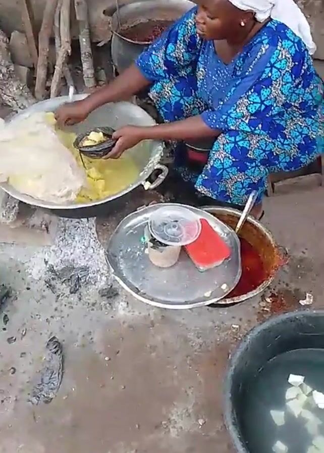 A woman wearing a blue patterned dress and a white headscarf is crouching near a large pot that is sitting over a fire. The woman is using a fork to transfer yellow pieces of food from a small black bowl into the large pot. There is another large pot, and a bucket with white cubes in the water, and a tray with some containers. There are some sticks leaning against the background, and there is a wall in the background as well. The ground is concrete.