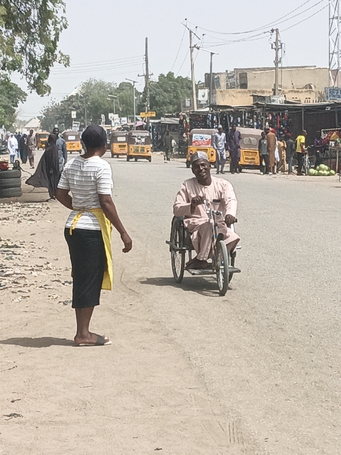 An outdoor scene in Hotoro South, Nigeria, depicts a bustling street environment under a bright sky. In the foreground, an unpaved, dusty brown ground transitions to a paved asphalt road. A woman, observed from the rear, stands on the left foreground, wearing a striped short-sleeved top, a dark skirt, and a yellow apron. She wears a dark head covering and light-colored sandals. In the mid-ground, a man in a light pink traditional garment and matching cap is seated in a three-wheeled, hand-propelled tricycle wheelchair, facing slightly left towards the woman and the camera, with a slight smile. His hands are positioned near the steering/propulsion mechanism. The background features a street lined with various commercial structures, including market stalls with merchandise like large green fruits (possibly watermelons). Numerous yellow motorized tricycles are visible on the road, alongside pedestrians. Utility poles with overhead wires are present on both sides of the street. Buildings of varying construction and age line the background, with some trees visible on the left side of the road and a stack of tires on the unpaved shoulder.