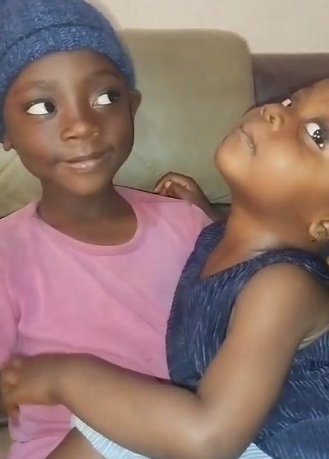 Two young girls are sitting together on a tan couch