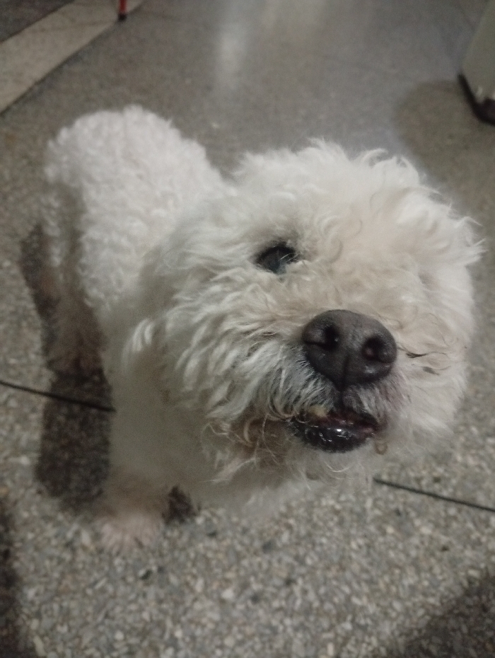 A white, curly-haired dog looks up towards the camera. Its nose is shiny and black, and its mouth is slightly open. The dog stands on a mottled grey floor. Its eyes are dark and soulful, creating an engaging expression. Its fur appears slightly matted around the mouth area. The image is taken at a close-up angle.