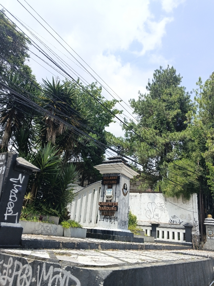 A welcome sign reading "Selamat Datang Di Kabupaten Bandung" marks the entrance to Bandung Regency. The sign, constructed of white pillars and a central panel, is covered in graffiti. Lush greenery surrounds the structure, including yucca plants and tall trees. Overhead, power lines crisscross the sky, contrasting with the blue and cloudy backdrop. The foregorund features a concrete barrier, also marked with graffiti.