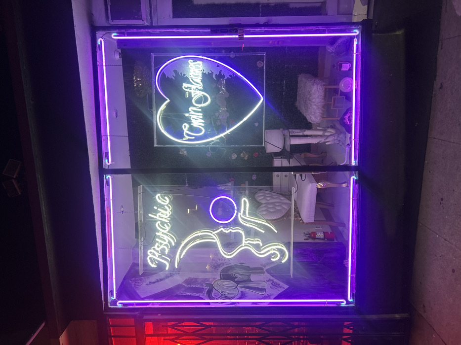 - "The image depicts the illuminated storefront of a psychic business at night, located in a commercial area of Los Angeles, United States, indicated by the partial address "403 HALF" visible on the right window frame" by FM-JqEJc2, licensed under CC BY 4.0