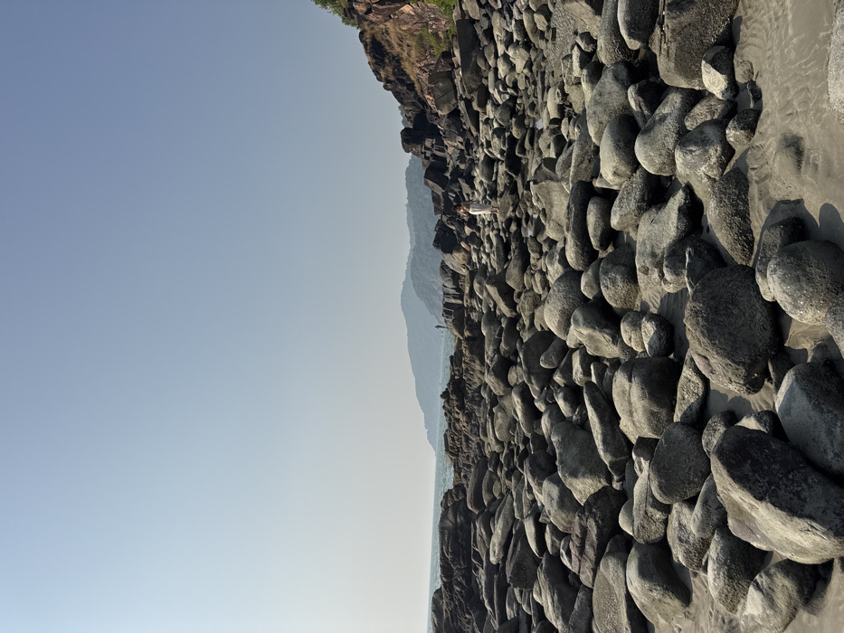 A landscape view shows a mass of rounded, gray rocks stretching along a beach, with some patches of sand visible between them. A mountain range is faintly visible in the background, partially obscured by haze. A cliff covered with greenery is at the top of the image. The sky is clear and light blue. A small figure in white stands among the rocks.