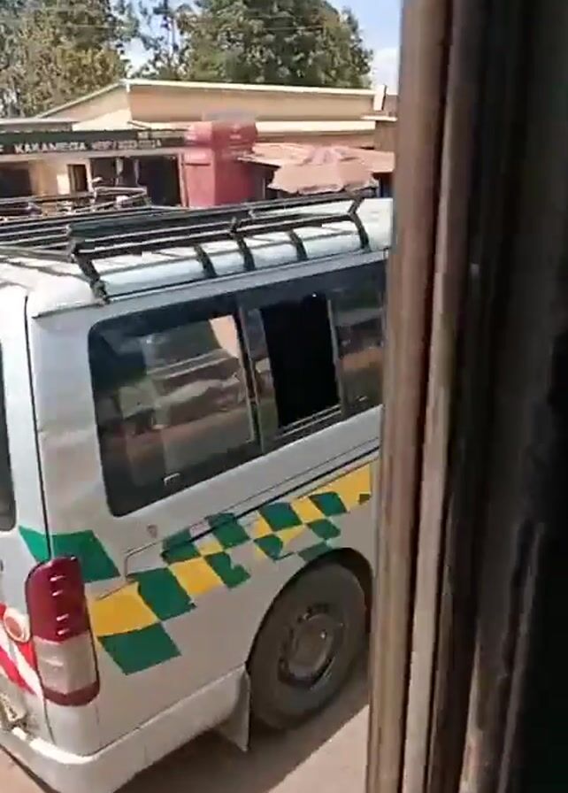 view from inside a moving vehicle, likely a bus or van, as it passes through a small town or village. People are walking along the dusty street, and several motorcycles are parked. There are shops or stalls lining the road, with corrugated metal roofs. A white van with yellow stripes pulls up on the other side of the vehicle, with text on its side reading "LUXURY SHUTTLE Eldoret KISUMU," and "WE TRAVELLERS SACCO Shuttle Nairobi KISUMU London BUYONA." Another vehicle, seemingly a car or SUV, is being loaded with goods on its roof, attended to by a person in a white shirt and red pants. Bags are on top of the vehicle. The environment appears to be a sunny day in a somewhat rural or less-developed area.
