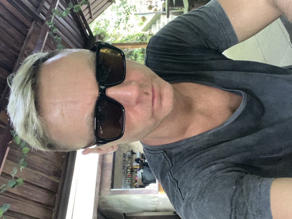 A fair-skinned man with short blonde hair and black sunglasses is the focal point. He's wearing a dark gray v-neck t-shirt. The background shows wood paneling with leafy green vines creeping up. A building interior is visible behind him with shelves displaying various items. The lighting appears bright and natural, suggesting an outdoor or well-lit indoor setting. The image is vertically oriented and appears to be taken from a slightly elevated angle.