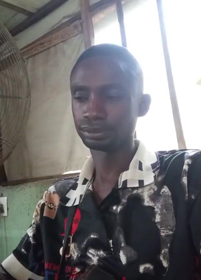 A man is looking at the camera in a medium shot. He has dark skin, short hair, and a short beard. He is wearing a short-sleeved, patterned shirt with a white collar. A small black bag is slung across his body. There's a partially visible fan to the left of the shot and a window with white bars behind him. A bright light shines through the window. A red plastic cup appears briefly in the lower left corner. The background appears to be a simple indoor setting. There is loud music playing.