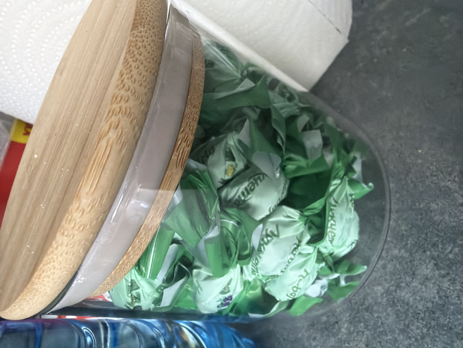 A clear cylindrical glass jar with a light brown bamboo lid is positioned on a dark, mottled countertop. The jar contains numerous individually wrapped candies, predominantly in light green and dark green foil or plastic wrappers. Visible text on some wrappers includes "Avellena," alongside small illustrations resembling berries and pineapples. To the left of the jar, a section of a blue plastic water bottle is present. To the right, a white roll of paper towels is partially visible. The background reveals indistinct red and yellow objects. The scene is located indoors within the city of Kavarna, Bulgaria.