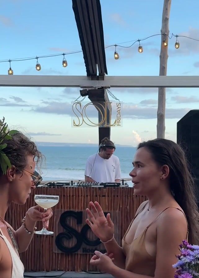 Two women are seen at an outdoor event with an ocean view and a DJ in the background. The woman on the left wears a white dress and has a floral arrangement in her hair, while the woman on the right wears a brown tank top. They are standing at a wooden table, and the woman on the left is holding a cocktail and takes a sip. On the table are two smartphones and a bottle with glasses. Behind them is a DJ booth with a man in a white t-shirt adjusting controls. A sign above the DJ reads "SOL Fridays." The ocean stretches out in the background under a cloudy blue sky, and the venue is decorated with string lights.