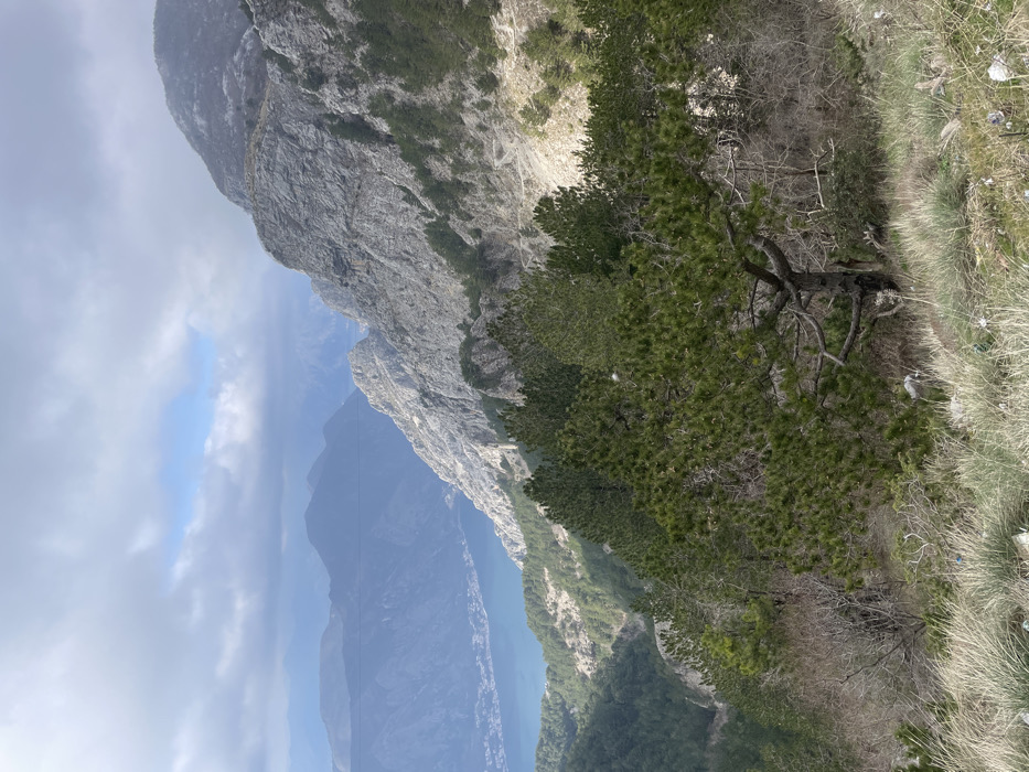 The scene captures a panoramic view from a hillside in Žanjev Do, Montenegro. The immediate foreground displays dry, light green grasses mixed with scattered white debris. A prominent pine tree with dark green needles and a robust, gnarled trunk is positioned in the lower center-right, with bare deciduous undergrowth behind it. The midground features a steep, grey limestone mountain face, partially covered by sparse coniferous trees, notably traversed by a light-colored, winding dirt path or track on its lower slope. To the left, a forested valley descends. In the background, a large body of deep blue water, consistent with the Bay of Kotor, is visible, with built-up areas along its shore. Hazy, layered mountains rise beyond the bay, all under an overcast sky featuring breaks of lighter blue. No individuals or specific actions are discernible.