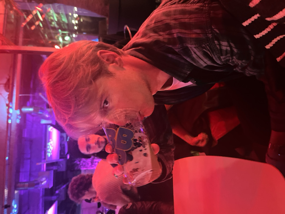 The image captures an indoor scene within a commercial establishment, likely a bar or club, illuminated predominantly by red and purple ambient lighting. In the foreground, a young adult male with light-colored, medium-length hair is depicted in profile, looking directly towards the viewer. He is holding a clear glass with his right hand, drinking from its rim. The glass features a blue and yellow crest-like logo, possibly containing the letters "UB," and contains a small amount of light-colored liquid with some foam residue. He is dressed in a dark, vertically striped collared shirt worn over a white t-shirt. In the mid-ground, behind the primary subject, other patrons are visible. To the far left, a person with curly dark hair and a light-colored top is partially obscured. Behind the main subject's left shoulder, another male with long dark hair, wearing a dark beanie and a mustache, is partially visible, also looking towards the camera. The background shows blurred elements consistent with a lounge or bar setting, including various colored light sources and reflections in a glass partition or window on the right side, suggesting an outside area or another lit space. A dark potted plant with large leaves, resembling a palm, stands near this partition. A large, translucent red object, possibly a lamp or a design element, is visible in the lower-left foreground. The specific location within the city of Lille, France, cannot be definitively identified from the visual information presented in the image.