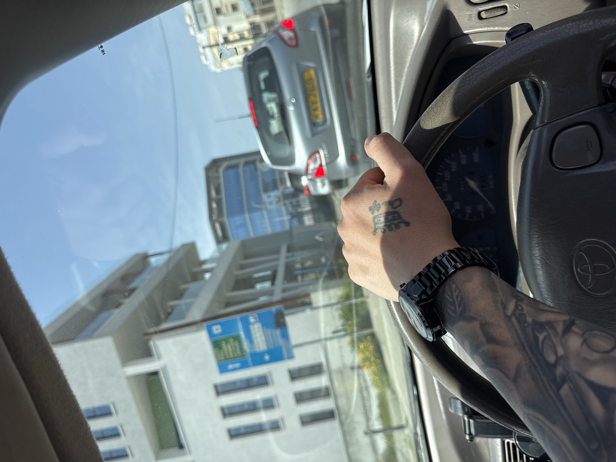 The scene is viewed from inside a vehicle, looking forward through the windshield in Kato Polemidia Municipality, Cyprus. A person's left arm and hand are prominently featured in the foreground, gripping a dark grey steering wheel. The arm displays extensive black-and-grey sleeve tattoos, while the back of the hand features a distinct black tattoo resembling an ornate letter or symbol. A black, chunky watch with a link bracelet is worn on the left wrist. The steering wheel prominently displays a Toyota logo in its center. A segment of the dashboard and speedometer, indicating a low speed, is visible behind the steering wheel, along with a black phone mount attached to the left dashboard vent. The vehicle is either stopped or moving slowly in traffic. Directly ahead is the rear of a silver/light grey first-generation Nissan Qashqai. Its brake lights are illuminated, and the yellow Cypriot license plate, "KXX 785," is clearly visible. Another vehicle is partially visible further ahead. To the left of the road, a modern, light-colored, multi-story building with vertical windows and glass-fronted balconies is present. In front of this building, a blue directional street sign with white text, likely in Greek, is positioned. Below the sign, a patch of ground with green vegetation and yellow flowers is visible. To the right, beyond the Nissan, other urban buildings are seen, including one with reflective blue glass elements. The sky above is clear blue with some light haze, indicating sunny weather.